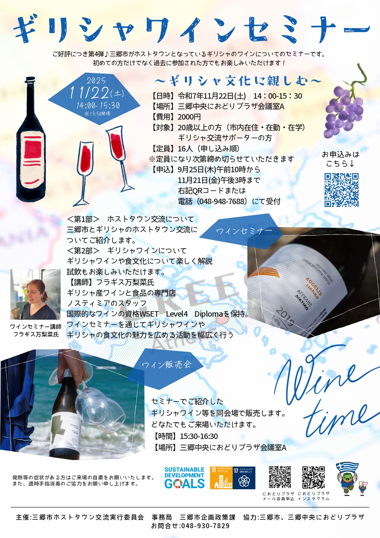 三郷市とギリシャのホストタウン交流についてご紹介し、ギリシャワインの特徴や食文化について楽しく解説します。試飲あり。